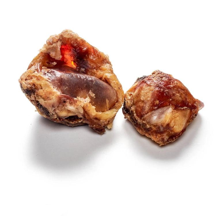 De aangeboden botten zijn runderknieschijven. Ze voldoen aan de natuurlijke behoefte van de hond om bijzonder goed te knagen en zijn tanden te poetsen. Omdat er nog kleine vleesresten op zitten, zal je viervoeter heel hard zijn best doen om het er eerst af te knagen en dus zijn het hier niet alleen de kiezen die nodig zijn.